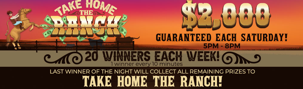 From 5pm - 8pm, 20 Winners Each Week! 1 Winner every 10 minutes! Last winner of the night will collect all remaining prizes to Take Home The Ranch!