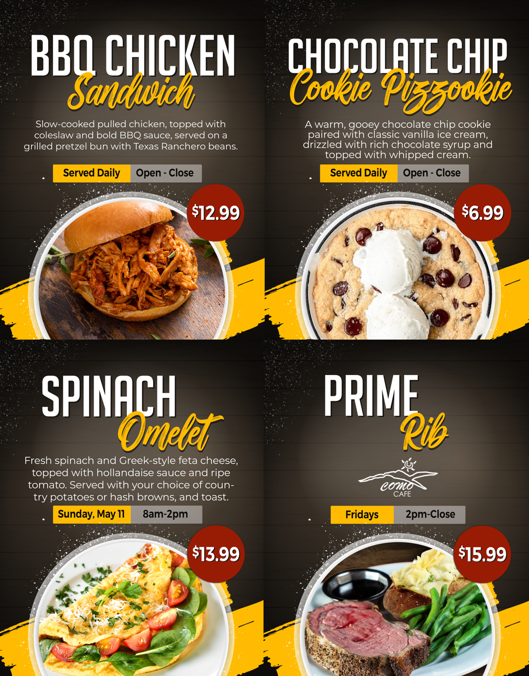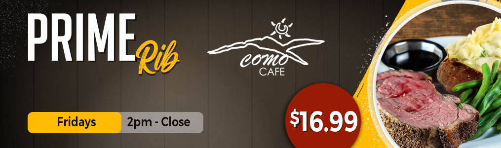 Hometown dining at the Como Café, where you’ll find an extensive menu of home-style meals prepared to satisfy any hunger. Stop by for breakfast, lunch or dinner, and don’t forget to check out the great line up of wonderful specials like our mouth-watering Prime Rib dinner with all the fixings. Come to the Como Café for great food and the very best service.
