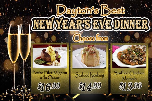 Choose between a Petite Filet Mignon a ’la Oscar $16.99, Seafood Newburg $14.99 or Stuffed Chicken Marsala $13.99. December 31 3pm-close