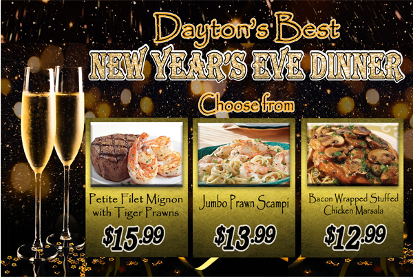 Dine in style with options! Choose between Bacon Wrapped Stuffed Chicken Marsala for $12.99, Jumbo Prawn Scampi for $13.99, or Petite Filet Mignon with Tiger Prawns for $15.99. Dec 31 3pm-close