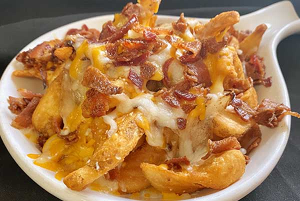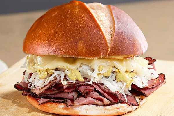 Daily 11am—close. Corned Beef Sandwich. Hot corned beef served on a pretzel roll. Topped with melted Swiss cheese, coleslaw and ale mustard. Served with French fries. $12.99.